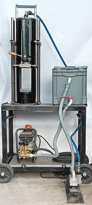Bild 2 zeigt die Presse mit 230 Volt Hochdruckreiniger Comet ETM 150 TS . Presskraft ist 25 t. Pressgeschwindigkeit = 10 mm / Sekunde