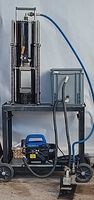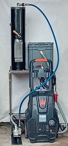 Im Bild neben dem Hochdruckreiniger der Vorratsbehälter für das Wasser und am Boden die Fußsteuerung