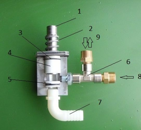 Wenn der Stößel (1) nach unten gegen den Ventilsitz aus POM bis zum Anschlag gedrückt wird dann staut sich das ansonsten frei zirkulierende Wasser und sucht sich seinen Weg (9) zum Zylinder und dieser entfaltet so seine Presskraft. Wird der Stößel nicht bis zum Anschlag gedrückt, dann teilt sich der Wasserfluss. Ein Teil strömt weiterhin in den Zylinder, der andere finden seinen Weg zum Vorratsbehälter über den Rückfluss (7), dies je nachdem wie groß der Spalt zwischen Stößel und Ventilsitz ist. Und so kann man sei es die Presskraft sei es die Zylindergeschwindigkeit regulieren, also das Ausfahren des Zylinders. Es soll aber auch der Rückhub sich regulieren lassen und da kommt das Saugventil (6) ins Spiel. Zufluss des Zylinder ist auch Rückfluss und endet ins Saugvenil (9)l. Je nachdem wie stark der Wasserstrahl, der über den Zufloss (8) das Saugventil durchströmt und im Ventilkörper Wasserdruck vorhanden ist , ergibt sich eine Sogwirkung. Der maximalste Sog ergibt sich wenn das Zweiwegeventil zur Gänze geöffnet ist und der Wasserfluss freie Fahrt hat. Wenn nun genanntes Ventil den Wasserdurchfluss drosselt, dann baut sich im T-Stück ein Druck auf und das Saugventil verliert seine Wirkung. Ab einem gewissen Punkt ist der Wasserdruck hoch genug das das Wasser nicht mehr aus dem Zylinder gesaugt wird sondern dort zurück.