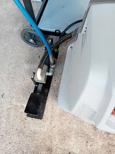 På billedet, ved siden af højtryksrenseren, er vandbeholderen, og på gulvet er fodbetjeningen.