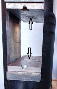 Billede 2 viser pressen med en 230-volt Comet ETM 150 TS højtryksrenser. Pressekraften er 25 tons, og pressehastigheden er 10 mm/sek. Adgangen til pressekammeret er 102 mm bred og 200 mm høj. I stedet for det sædvanlige design for smedepresser med sidesøjler til styring, har vi forlænget cylinderrøret. Rørvæggene varmes op og udstråler varme tilbage, hvilket bremser afkølingen af det smedede stål.